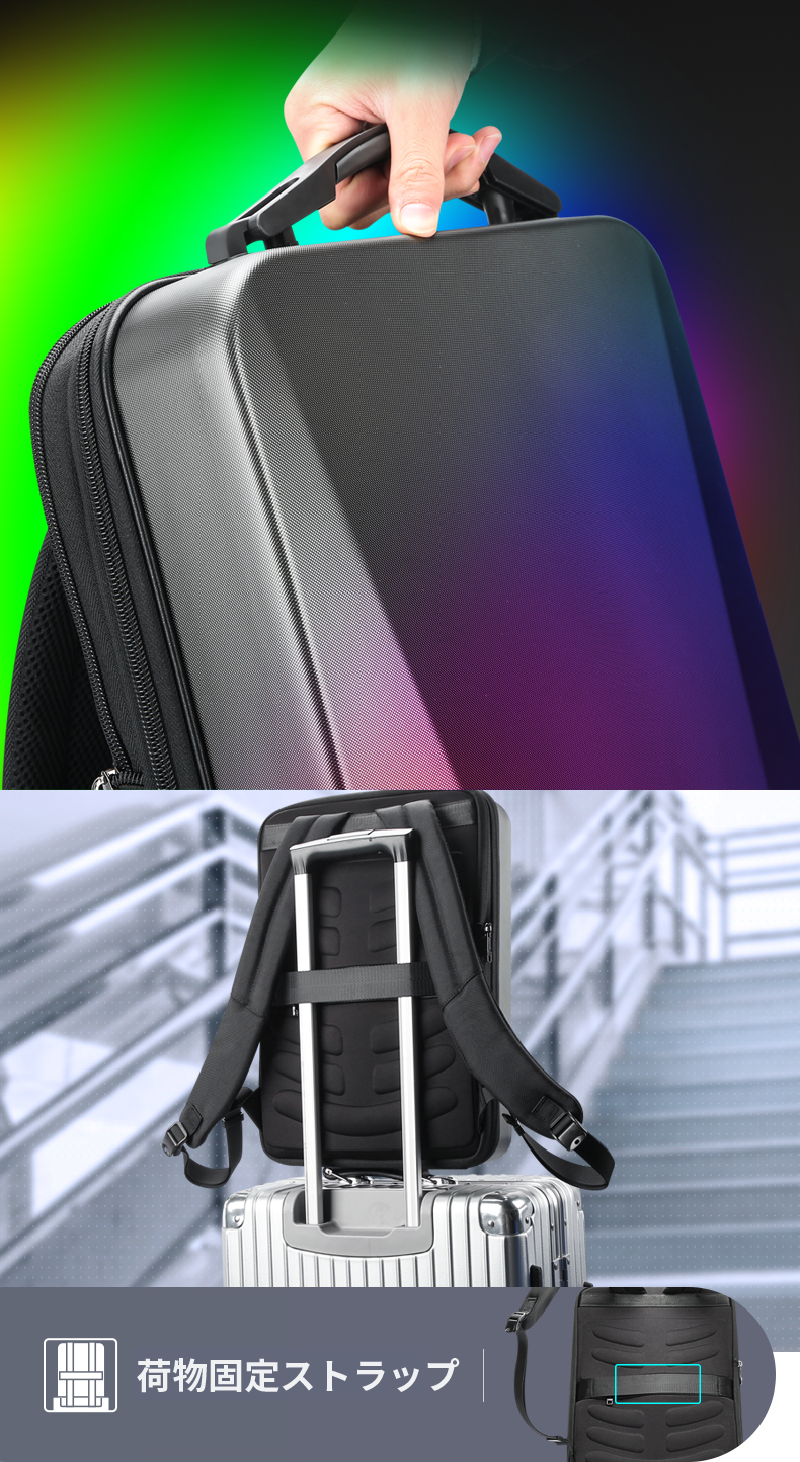 バックパックをスーツケースにしっかりと固定して持ち運ぶことができます。