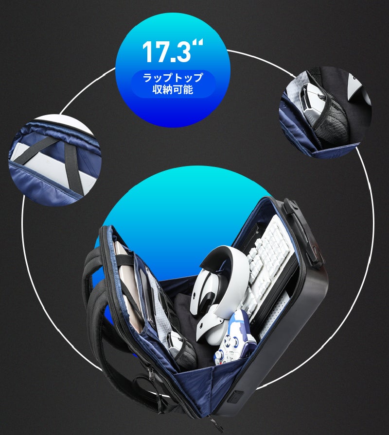【外部からアクセスできるUSBポート/キズ防止/防水/大容量/17.3インチPC収納/TSAロック付き】