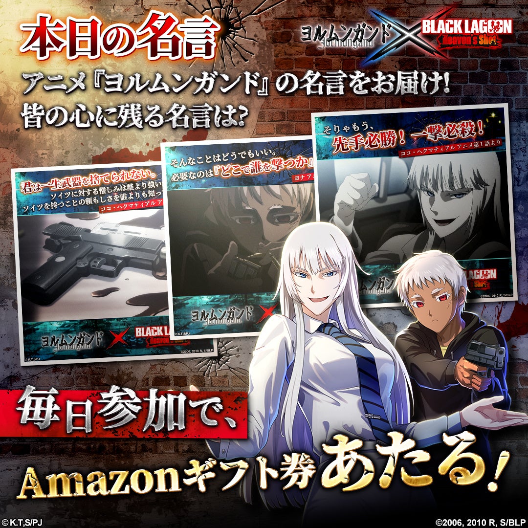 CTW株式会社は、G123で配信中のHTML5ゲーム『BLACK LAGOON Heaven's Shot(通称:ブラクラHS)』にて、「ヨルムンガンド」とのコラボイベントを開始しました。