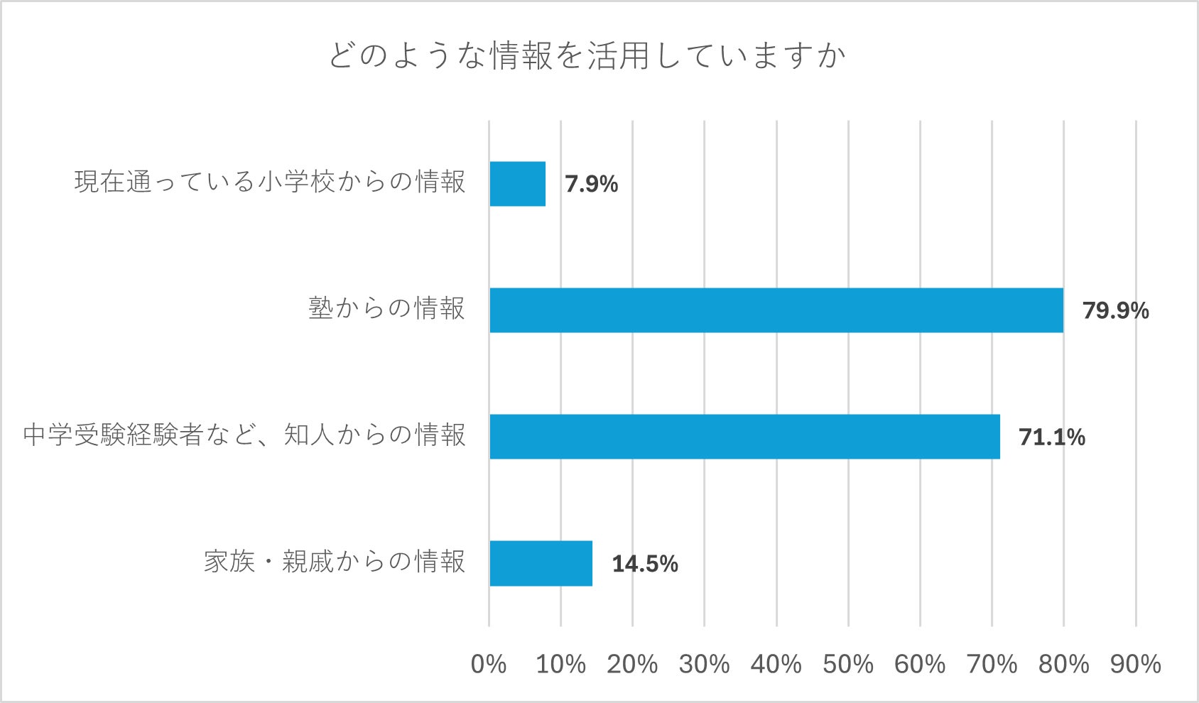 次に、【通っている小学校や塾、知人からの情報収集】に関して、小学生保護者の70.5%が小学校や塾、知人から情報収集を「行っている」と回答した。活用している情報は、「塾からの情報」が79.9%、「中学受験経験者など、知人からの情報」が71.1%だった。