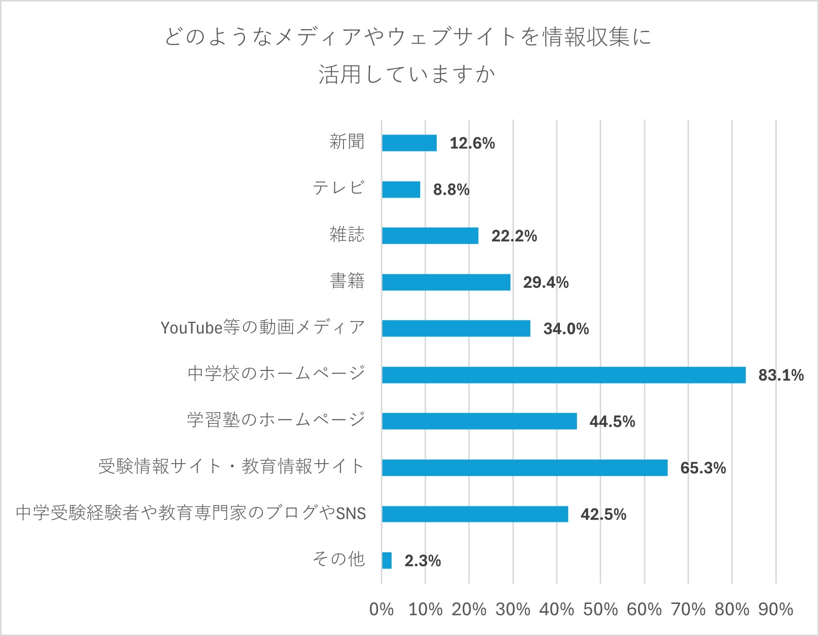 これから中学受験を予定している小学1年生~6年生の保護者に、現在の情報収集について聞いた。まず、【メディアやウェブサイトからの情報収集】に関して、小学生保護者の81.2%がメディアやウェブサイトから情報収集を「行っている」と回答した。活用しているメディアやウェブサイトは、「中学校のホームページ」が83.1%、「受験情報サイト・教育情報サイト」65.3%だった。