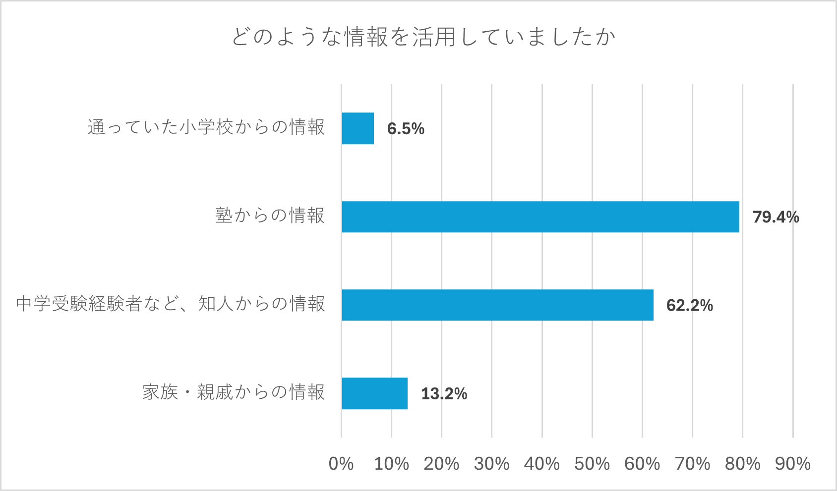 次に、【通っていた小学校や塾、知人からの情報収集】に関して、中学受験経験者の90.5%が小学校や塾、知人から情報収集を行っており、メディアやウェブサイトからの情報収集と同じく、小学3・4年生で情報収集を始めた人が全体の約半数だった。活用した情報は、「塾からの情報」が79.4%、「中学受験経験者など、知人からの情報」が62.2%と多かった。小学校や塾、知人からの情報収集を始めた時期については、70.3%が「適切だった」と回答した。