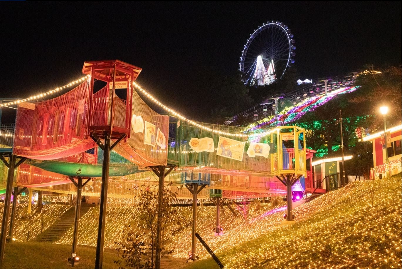 20種類のアクティビティを楽しめる空中ネットアスレチック「ハッスルスパイダー」がカラフルにライトアップし、光に照らされた中で思いっきり身体を動かして遊べる「光の空中アスレチック」として楽しめるほか、小さなお子様も楽しめるアトラクションがあるパディントンタウンでは、光の中をトロッコ型のミニコースターで駆け抜ける「とつげき!パディントン探検隊」や、のんびり楽しく光の汽車の旅を楽しめる「しゅぱつ!パディントン号」などが揃うなど、園内には、イルミネーションに囲まれながら、10種類のナイトアトラクションが楽しめます。そのほか、全長250mのリフトに乗ってイルミネーションの上空を空中散歩する「虹のリフト」や標高370mにそびえる「光のかんらんしゃ」など、起伏に富んだアウトドアリゾートならではの「空から眺めるイルミネーション」が充実しています。