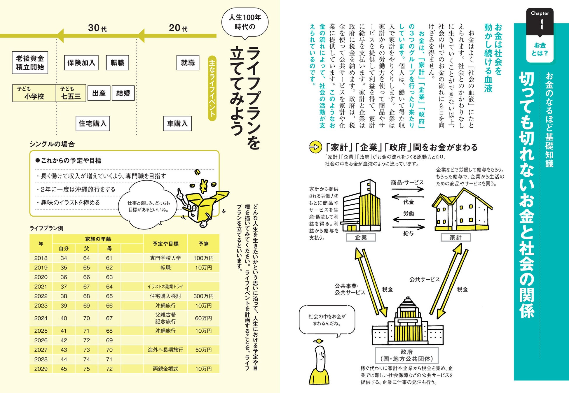 『お金の超基本』ではまず、お金が私たちの生活にどうかかわっているのかを具体的に知ることができます。たとえば、人生のいつごろどんなお金がかかるのか、世の中のお金の流れについて、イラストや図をふんだんに用いて解説されています。見るように読めて、お金を身近に感じることができます。