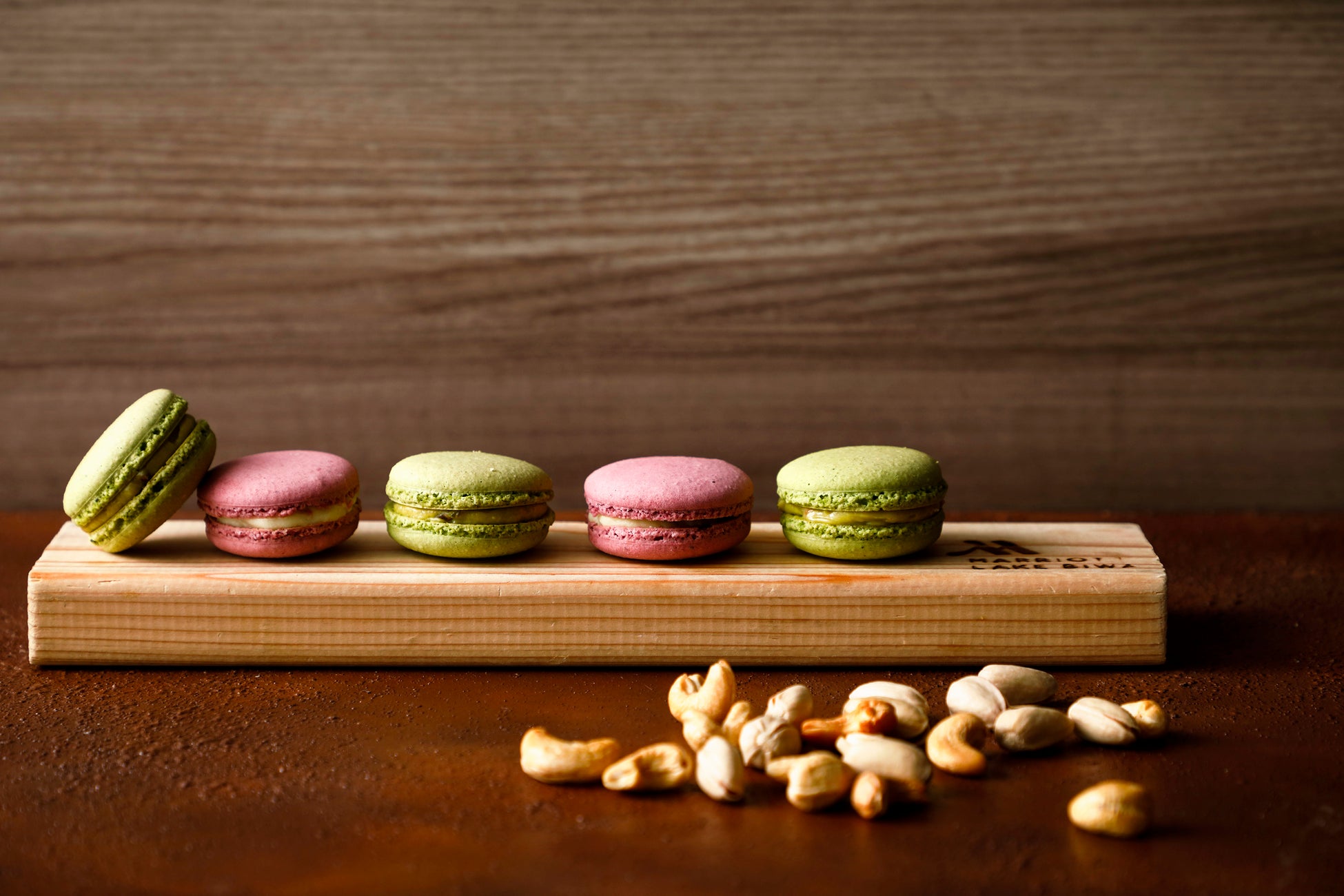 アフタヌーンティーをお召し上がりいただいた方限定で、オプションで「Going Nuts!」の燻製カシューナッツとピスタチオを使用した「燻製ナッツマカロン」をご購入いただけます。口の中に燻製の風味が広がるユニークな味わいのマカロンをご家庭でもお楽しみいただけます。手土産や大切な方へのプレゼントにもおすすめです。