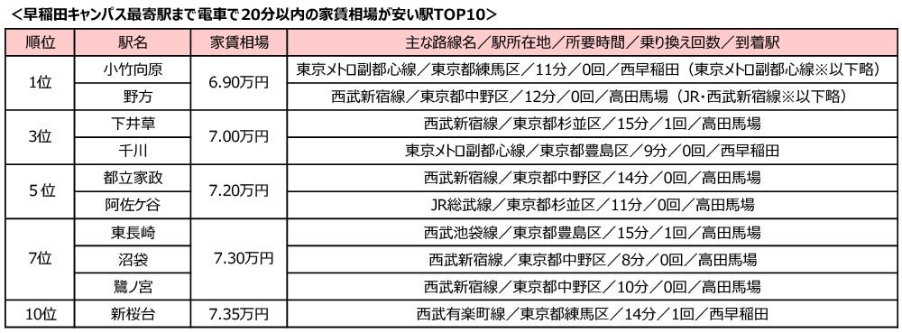 【調査対象駅】SUUMOに掲載されている高田馬場駅、西早稲田駅、早稲田駅(メトロ、都電)まで20分以内の駅(掲載物件が11件以上ある駅に限る)