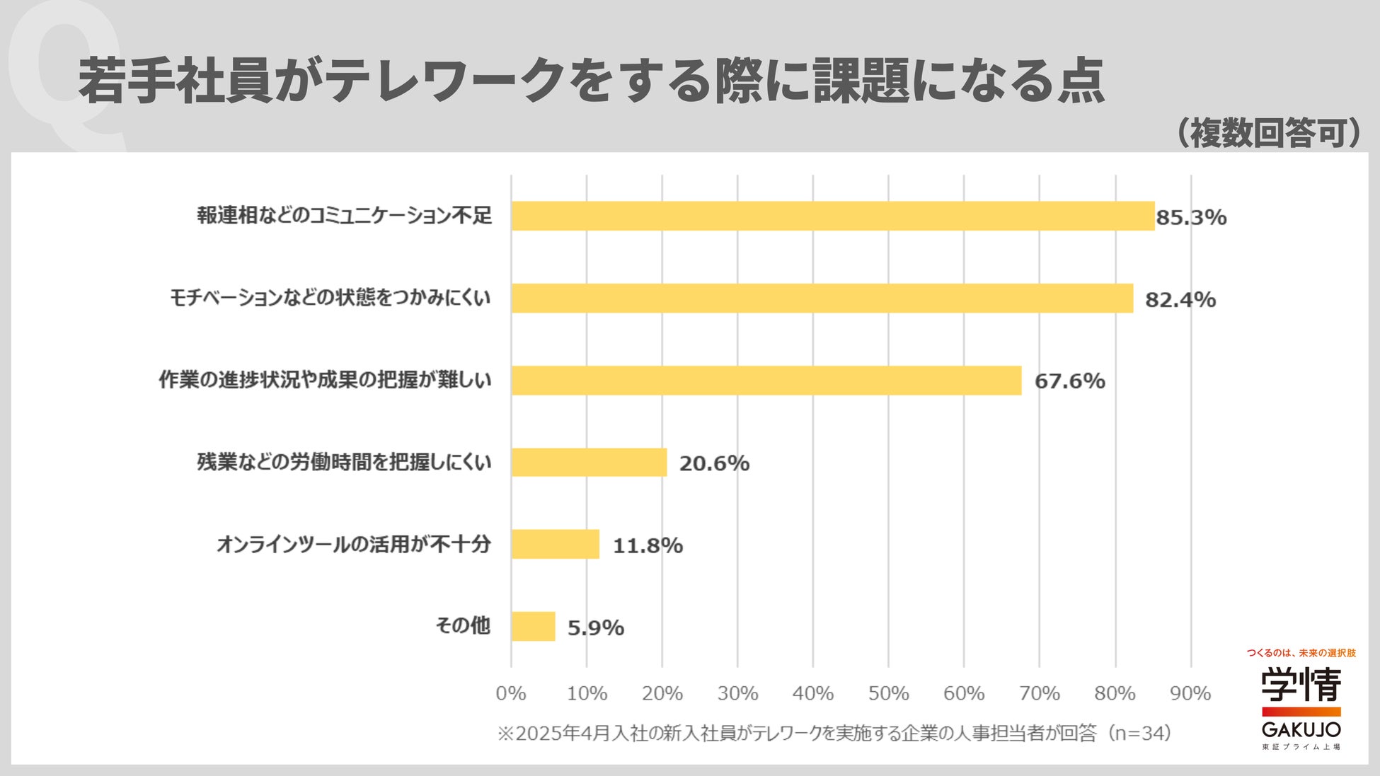 若手社員がテレワークを実施する際に課題になる点は、「報連相などのコミュニケーション不足」が85.3%で最多。次いで、「モチベーションなどの状態がつかみにくい」82.4%、「作業の進捗状況や成果の把握が難しい」67.6%が続きました。