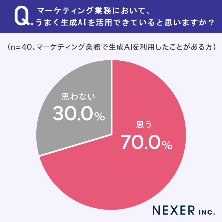 7割の方がマーケティング業務において、うまく生成AIを活用できていると「思う」と回答しています。