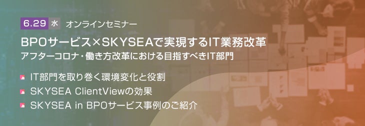 トランスコスモス株式会社(本社:東京都豊島区、代表取締役社長兼COO:奥田昌孝)は、オンラインセミナーBPOサービス×SKYSEAで実現するIT業務改革を6月29日(水)に開催します。
