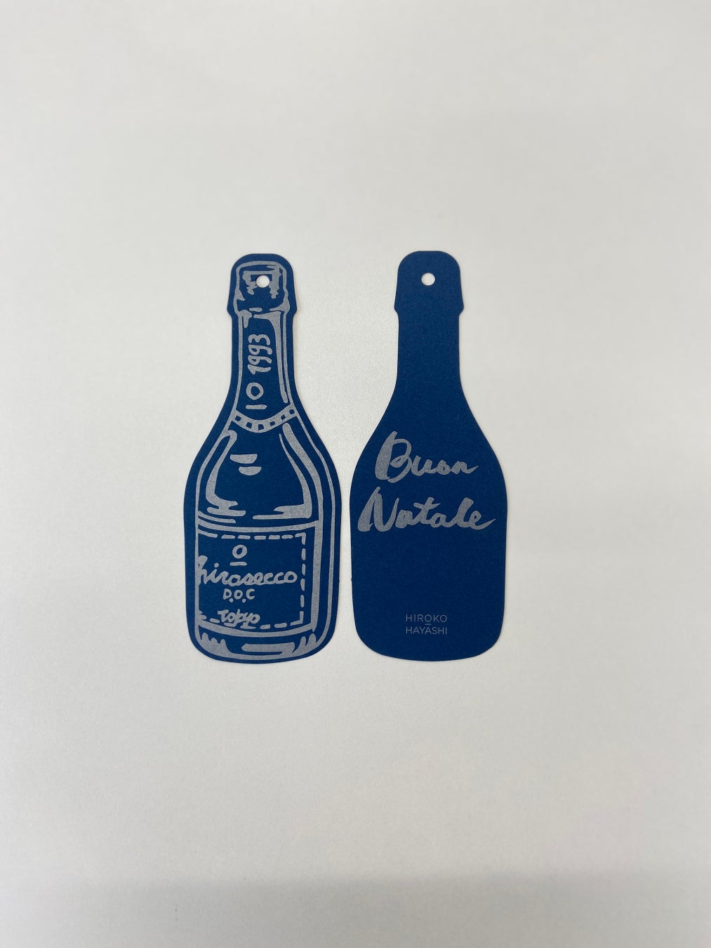 ヒロコ ハヤシの直営店にて商品をお買い上げいただくと、オリジナルデザインのシャンパンボトル型メッセージカードを差し上げます。