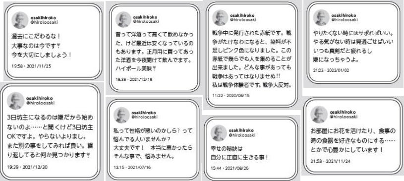 70歳で手話の勉強、83歳で麻雀再開など、常に活動的な大崎さん。78歳でMacを使い始め、ツイッターの存在を知りました。2011年の震災時、電話が繋がらずツイッターで家族と連絡をとれたことで、改めてSNSの力を痛感。震災後につぶやくと、“高齢でSNSを使いこなすすごい人”と話題となり、以後、等身大の言葉や前向きなつぶやきが幅広い世代に支持されるように。