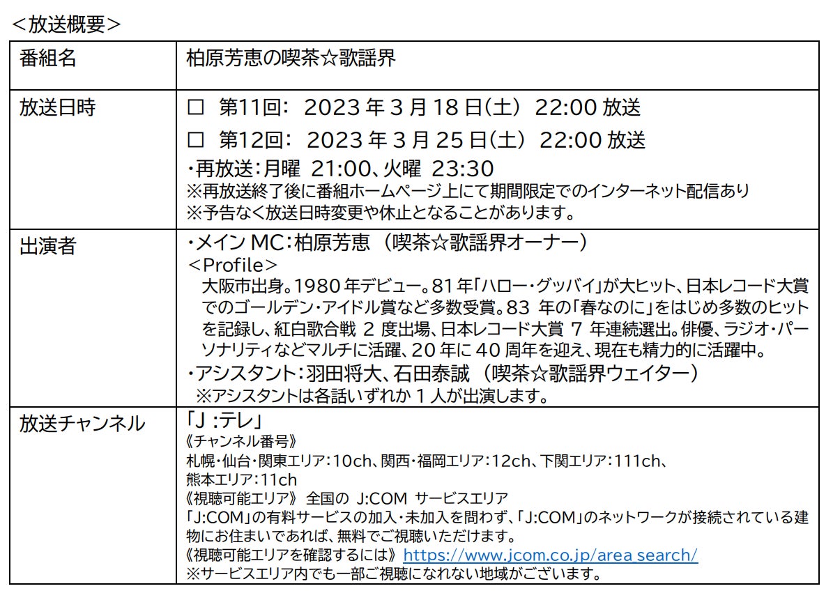 JCOM 株式会社(J:COM、本社:東京都千代田区、代表取締役社長:岩木 陽一)は、全国 1,400万世帯で視聴可能な J:COM のコミュニティチャンネル「J:テレ」で、1 月より毎週土曜日22時から柏原芳恵さんをメインMCに迎え、『柏原芳恵の喫茶☆歌謡界』を無料放送しています。3月18日(土)放送回では、庄野真代さんをゲストにお迎えし放送いたします。