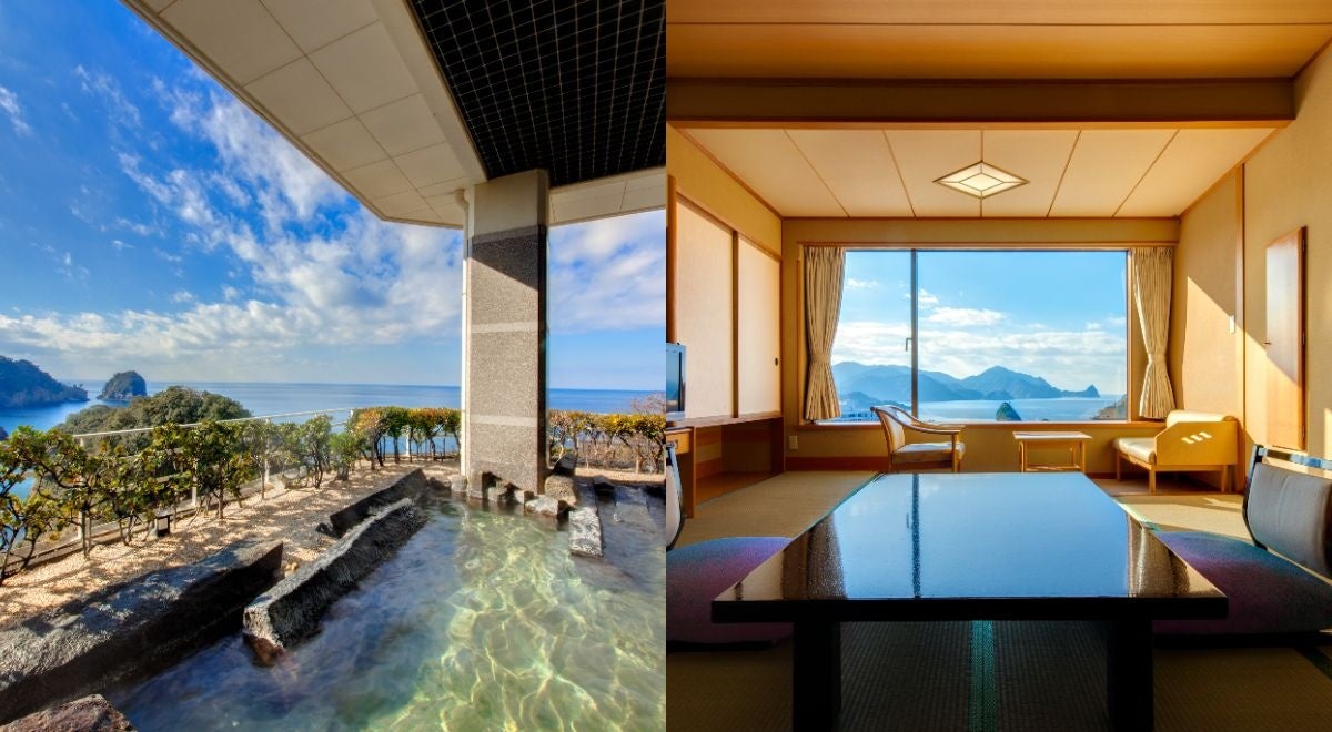 堂ヶ島の魅力は、どこまでも青い海と起伏に富んだ海岸線。当ホテルのお部屋は 海を見下ろすオーシャンビュー。