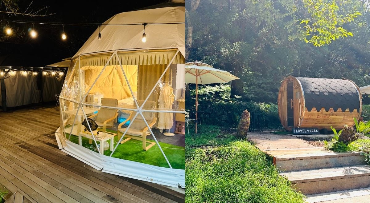 ドームテントやサファリテント、ロッジ、キャンプサイトなど多彩な宿泊スタイルをご提供。敷地内には北欧スタイルのバレルサウナや清流もあります。
