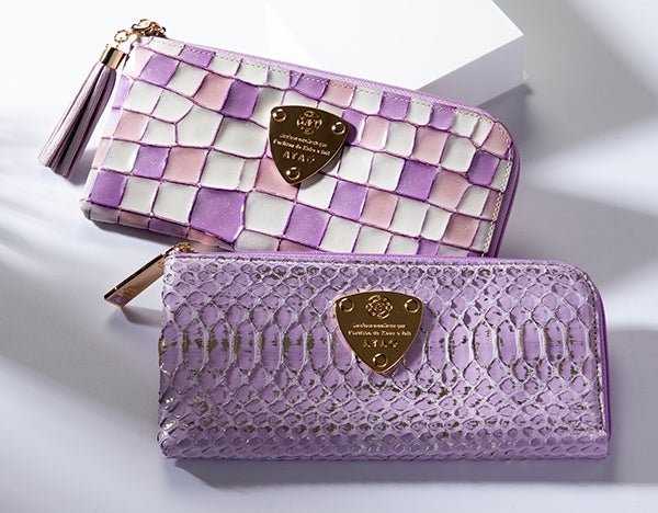 ↑●<アタオ>長財布 31,900(奥)/35,200円(前):風水では厄落としの色とされている、新色のラベンダーカラー。薄マチでスマートながらたっぷり収納できて、開閉しやすいL字ファスナータイプです。(4Fバッグ売場)