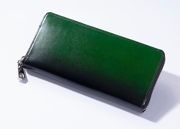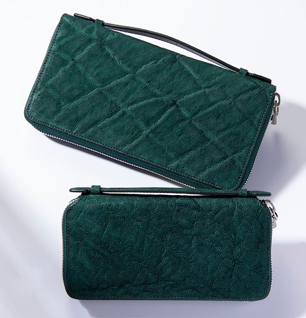 「幸運の神様」と呼ばれる「エレファントレザー」を、今年の開運カラー"エメラルドグリーン"に染めあげました。内装には丈夫なカーフレザーを使用。(8F紳士雑貨売場)