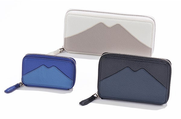 ↑●<FUJITAKA meets>長財布 39,600 円/キーケース 24,200円/2つ折り財布33,000円:音楽プロデューサー・松任谷正隆氏とコラボ。「松任谷」のMと「Mt.Fuji」のMをイメージしたデザインと、イタリアンレザーの美しい発色、ソフトなタッチが特徴です。(8F紳士雑貨売場)