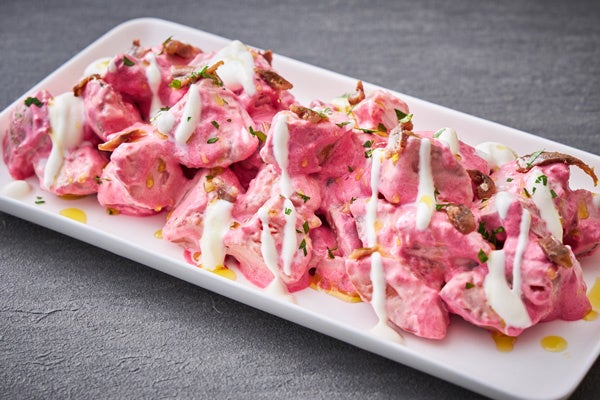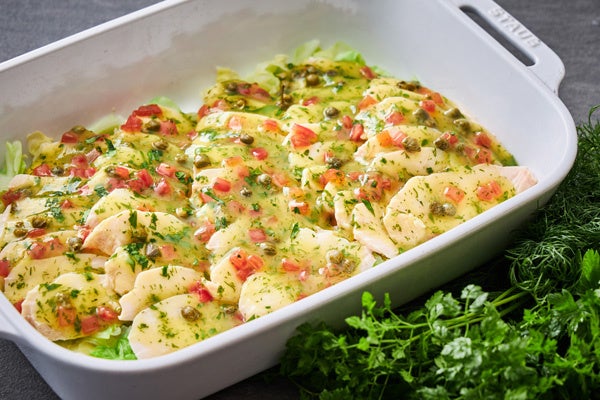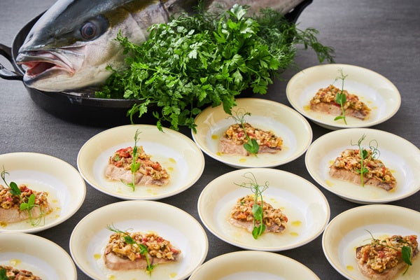 西洋料理からは、適度な脂でさっぱりとした味わいの新潟県産ワラサを鉄板焼きにてご提供します。野菜やりんごの旨味たっぷりのソースと、滑らかなカブのピューレと共にお召し上がりください。また、柔らかい肉質と低カロリー・高タンパクが特徴のブランド鶏「信州福味鶏」を薄くスライスしてご提供する‟エギュイット“は、トマトやケッパーを使用した爽やかな酸味のソースとの相性抜群な一皿です。