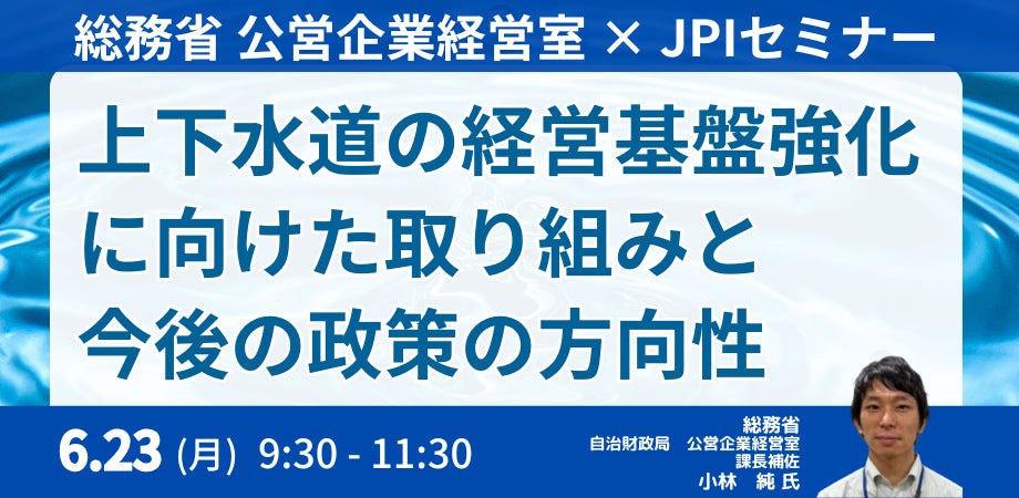 JPI(日本計画研究所)は、総務省 自治財政局 公営企業経営室 課長補佐 小林 純 氏を招聘し、上下水道の経営基盤強化に向けた取り組みと 今後の政策の方向性について詳説いただくセミナーを開催します。