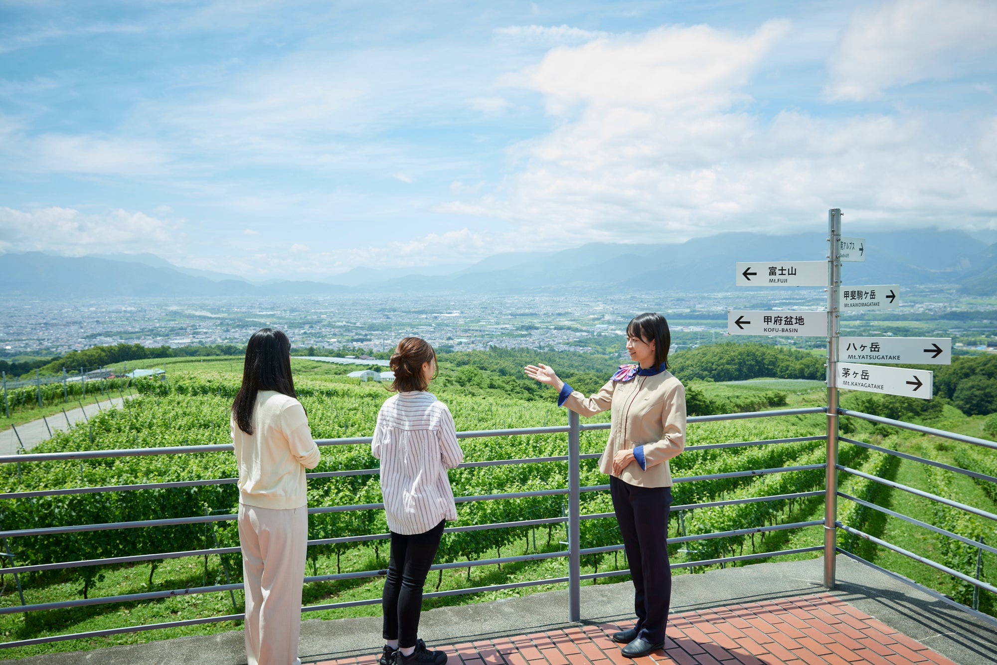 登美の丘ワイナリーの豊かな自然環境を感じながら、つくり手の技、ものづくりにかける情熱と挑戦を体感できるツアーです。案内係と広大な敷地内をバスで移動しながら、まず甲府盆地を見渡せる眺望台からの景色や、ぶどう畑をご覧いただきます。その後、「FROM FARM醸造棟」や熟成庫で、実際の仕込工程の現場を間近でご覧いただきます。見学後は、「SUNTORY FROM FARM 登美の丘 甲州 2022」「同 登美の丘 赤 時のかさね」など、計4種のワインをお楽しみいただけます。