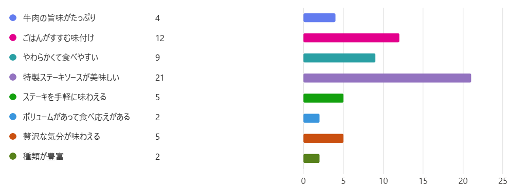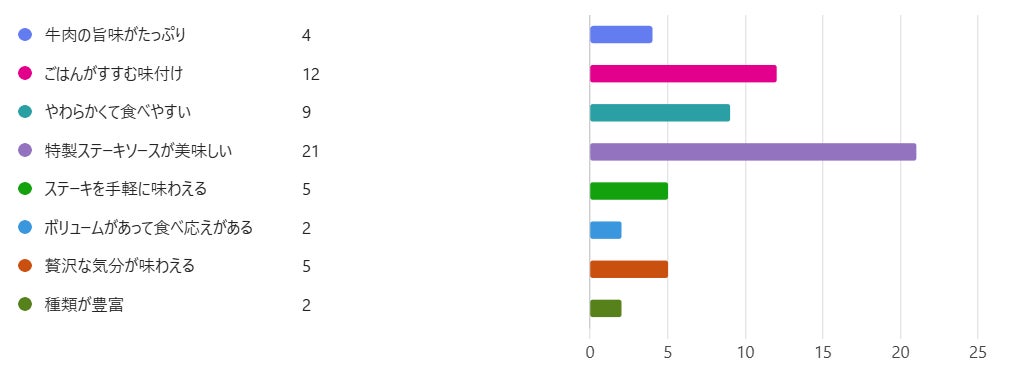 最も多くの票を集めたのは『特製ステーキソースが美味しい』というポイントでした。2位は『ごはんがすすむ味付け』、3位は『やわらかくて食べやすい』でした。