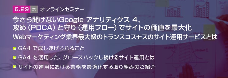 【トランスコスモスオンラインセミナー】今さら聞けないGoogleアナリティクス4、攻め(PDCA)と守り(運用フロー)でサイトの価値を最大化を6/29(水)に開催