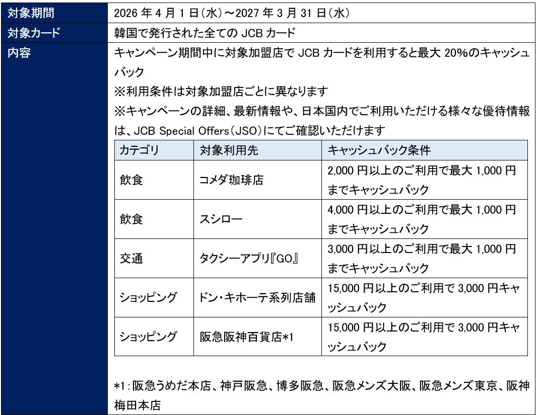 日本発唯一の国際カードブランド運営会社である株式会社ジェーシービー (本社:東京都港区、代表取締役会長 兼 執行役員社長:二重 孝好) の海外業務を行う子会社、株式会社ジェーシービー・インターナショナル(本社:東京都港区、代表取締役社長:陽川 勝樹)(以下、総称してJCB)は、訪日旅行者向けにBigな優待を提供する「JCBig」プロモーションの一環として、2026年4月1日より、日本を訪れる韓国のJCB会員様を対象とした大型キャッシュバックキャンペーンを開始いたします。