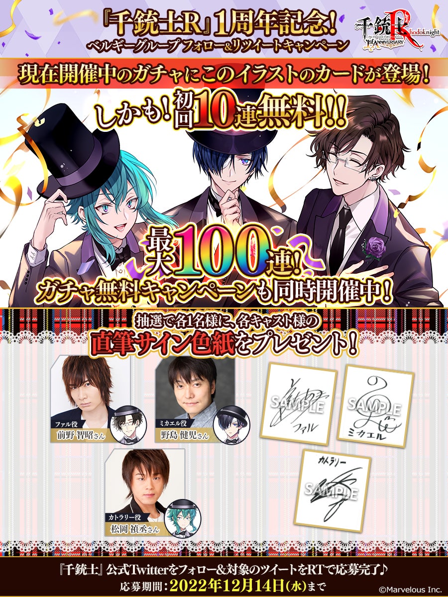 ベルギーグループのピックアップガチャの開催にあわせて、『千銃士』公式Twitterアカウントでは前野智昭さん(ファル役)、野島健児さん(ミカエル役)、松岡禎丞さん(カトラリー役)の直筆サイン色紙が抽選で各1名様に当たるフォロー&リツイートキャンペーンを開催中です。応募の締切は2022年12月14日(水)23:59まで!奮ってご応募くださいませ!