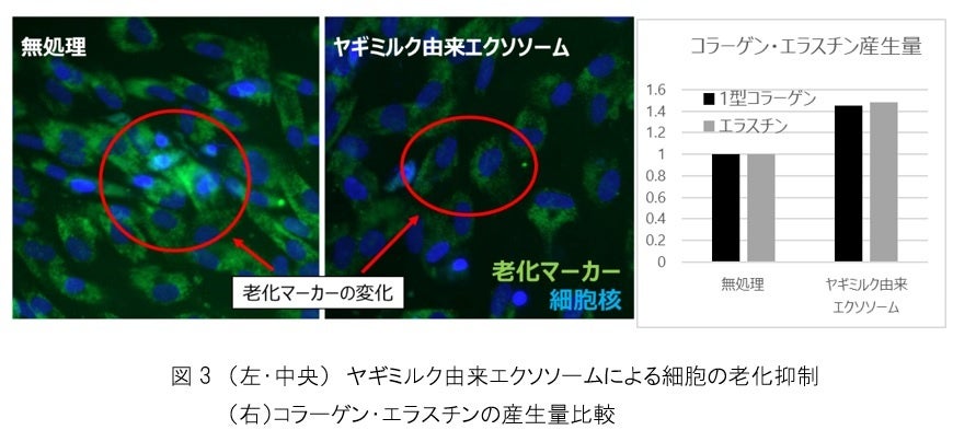 ヤギミルク由来エクソソームが、コラーゲンとエラスチン産生に与える影響を検証しました。その結果、ヤギミルク由来エクソソームを老齢細胞へ添加することにより、細胞の老化マーカーの発現が低下し(図3 左・中央画像の緑部分)、1型コラーゲンやエラスチン産生量が増加することを発見しました(図3 右)。