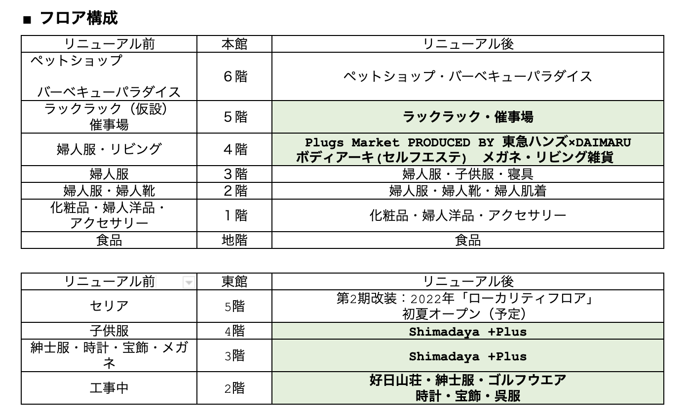 | <全館リニューアルの概要> 全館売場面積の約70%をリニューアルします 改装面積:7,350㎡(全館売場面積:10,500㎡) 売場の約70%をリニューアル 改装対象フロア:第1期:本館2階・3階・4階・5階、東館1階・2階・3階・4階 第2期:東館5階 ※食品フロアは2021年9月に改装しております リニューアルオープン:第1期:2022年3月25日(金):第2期:2022年初夏(予定) |