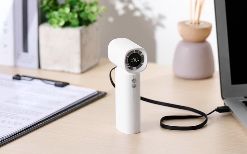 持ち手を折り曲げて卓上ファンとしても使えます。外出時は首にかけて涼しさを持ち運び、屋内では机に置いて快適に。シーンに合わせた使い方が魅力です。