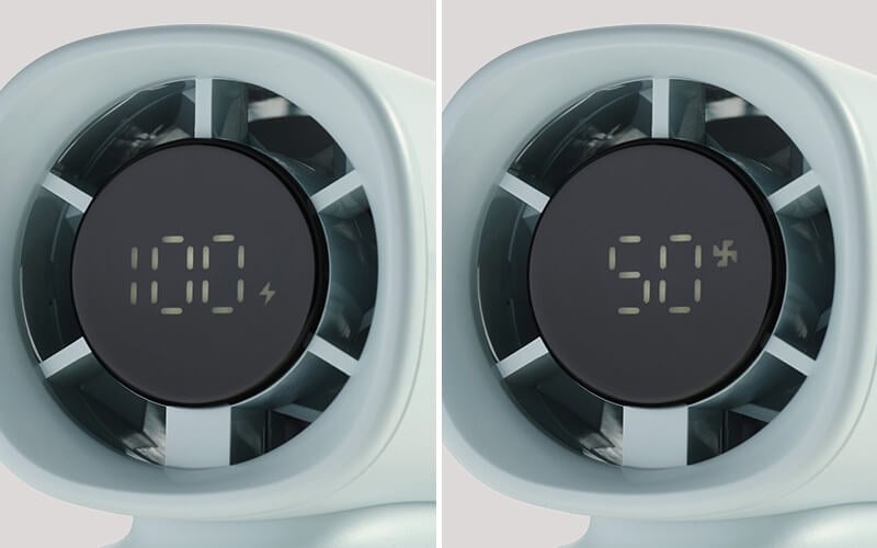 風量・充電・残量がひと目で分かるデジタル表示付き。外出前に充電残量をチェックできるので、安心して持ち歩けます。