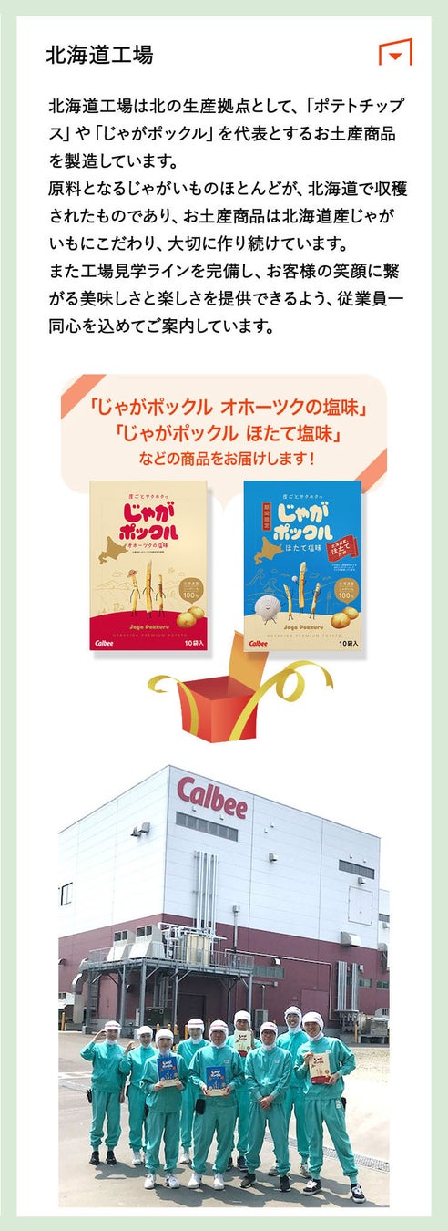 カルビーは1949年に広島県で創立しました。1964年には天然えびを殻ごとまるごと使った「かっぱえびせん」を発売。1968年に宇都宮工場の操業をスタートし、翌年には千歳工場(現在の北海道工場)の操業を開始するなど、国内の生産拠点を拡大してきました。それに伴い、ジャガイモを使った「サッポロポテト」(1972年)や「ポテトチップス」(1975年)、「じゃがりこ」(1995年)を発売。1991年にはオーツ麦を主原料にした「フルグラ®」(当時は「フルーツグラノーラ」)を発売するなど、「掘りだそう、自然の力。」をコーポレートメッセージに、素材本来の味わいを活かした商品を生み出してきました。現在では、カルビーポテト株式会社やジャパンフリトレー株式会社、カルビーかいつかスイートポテト株式会社などグループ会社を含め、全国各地の拠点で様々な商品を生産、販売しております。