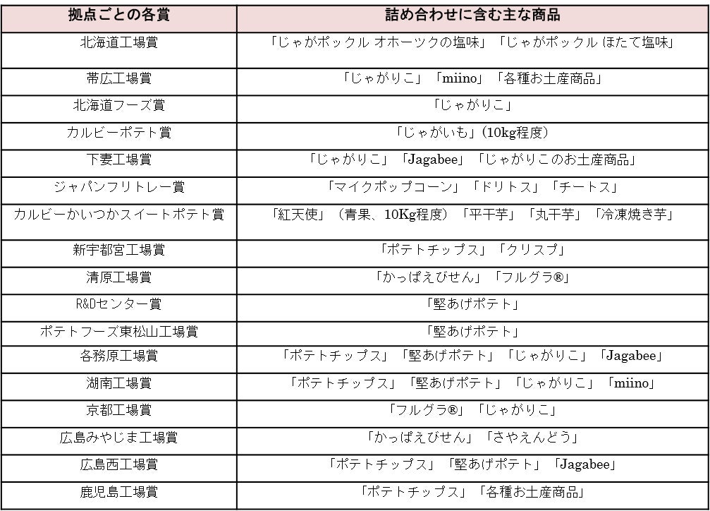 【拠点ごとの各賞と、詰め合わせに含む主な商品の一覧】