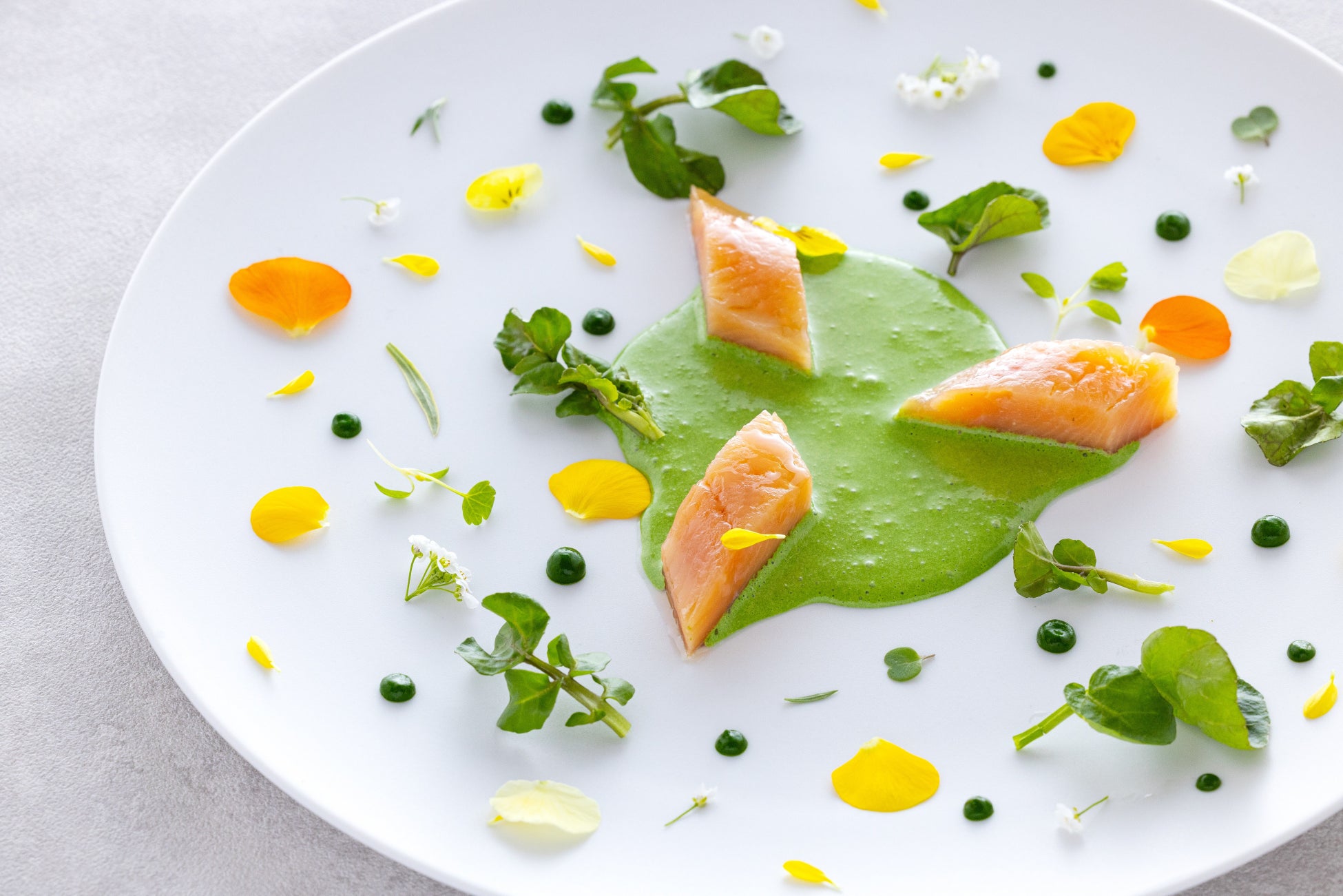 ヒメマスのミキュイ クレソンのソース