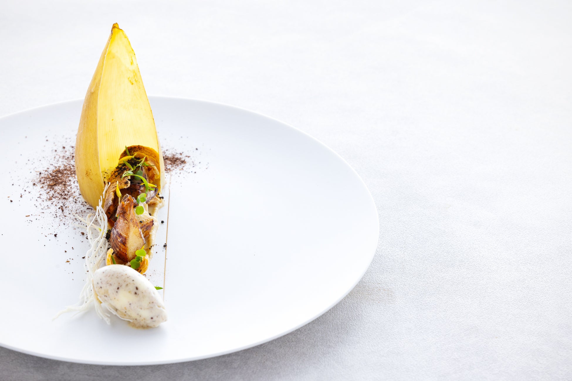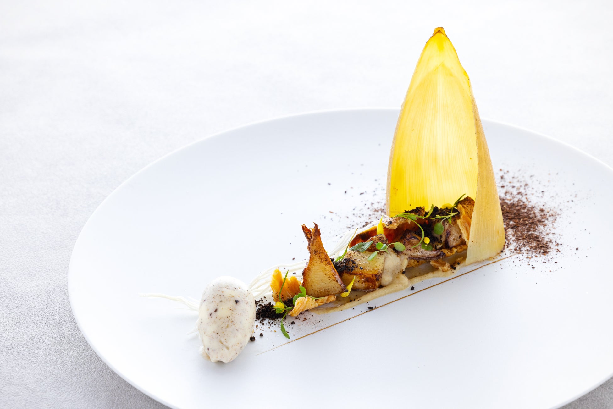 春の味覚の代表格ともいえる筍。シャキッとした食感に、滲み出る甘みと香りが魅力です。クルート(パイの皮)のサクッとした食感を加えることで、筍をより際立たせています。また、香ばしさの中に甘さを感じさせる藁と米のソルベを合わせて、筍の甘みと香りを増幅させました。焼き上げた熱々の筍と冷たいソルベの組み合わせに食事の楽しさも広がります。筍の美味しさを存分に堪能するひと皿です。