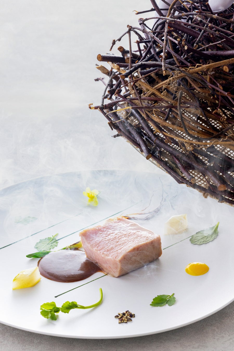 ミルキーで甘い風味がある仔牛を、まろやかに焼き上げました。軽やかで軟らかく、とろけるような舌触りに加え、口の中にはジューシーな肉汁とともに、肉の甘みがふわりと広がります。その甘さを引き立てているのは、黒文字の清涼感のある香りです。樹皮に芳香がある黒文字は、春に香りが強くなります。黒文字の香りを抽出したソースと、燻製の香りづけにより、仔牛がいっそう味わい料理となっています。