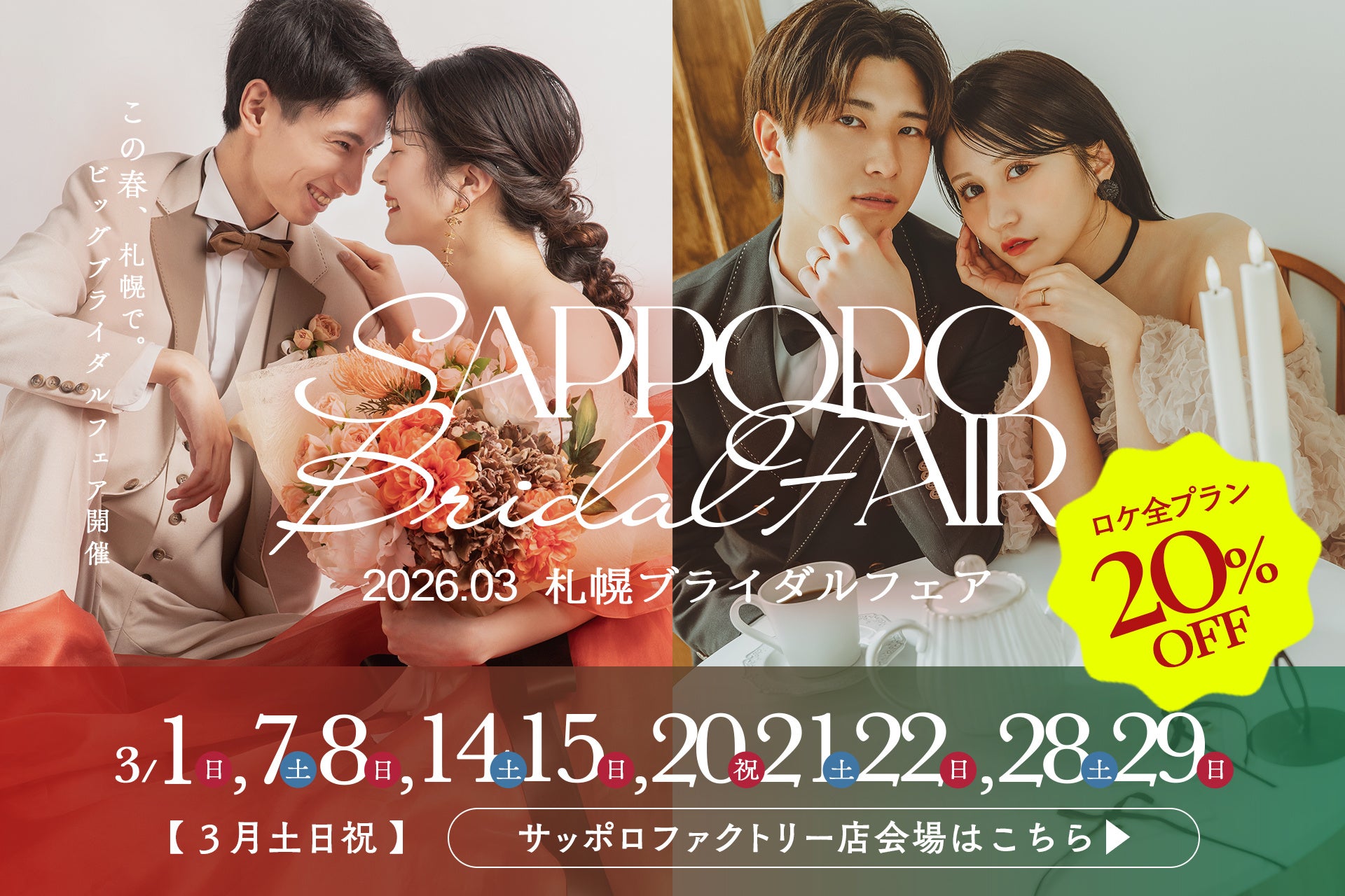 この度、2026年3月土日祝限定で、お得で楽しいブライダルフェアを札幌エリアの店舗で開催します。運命の一着を探している方、憧れのドレスを試着したい方は、この機会にぜひご来店ください。