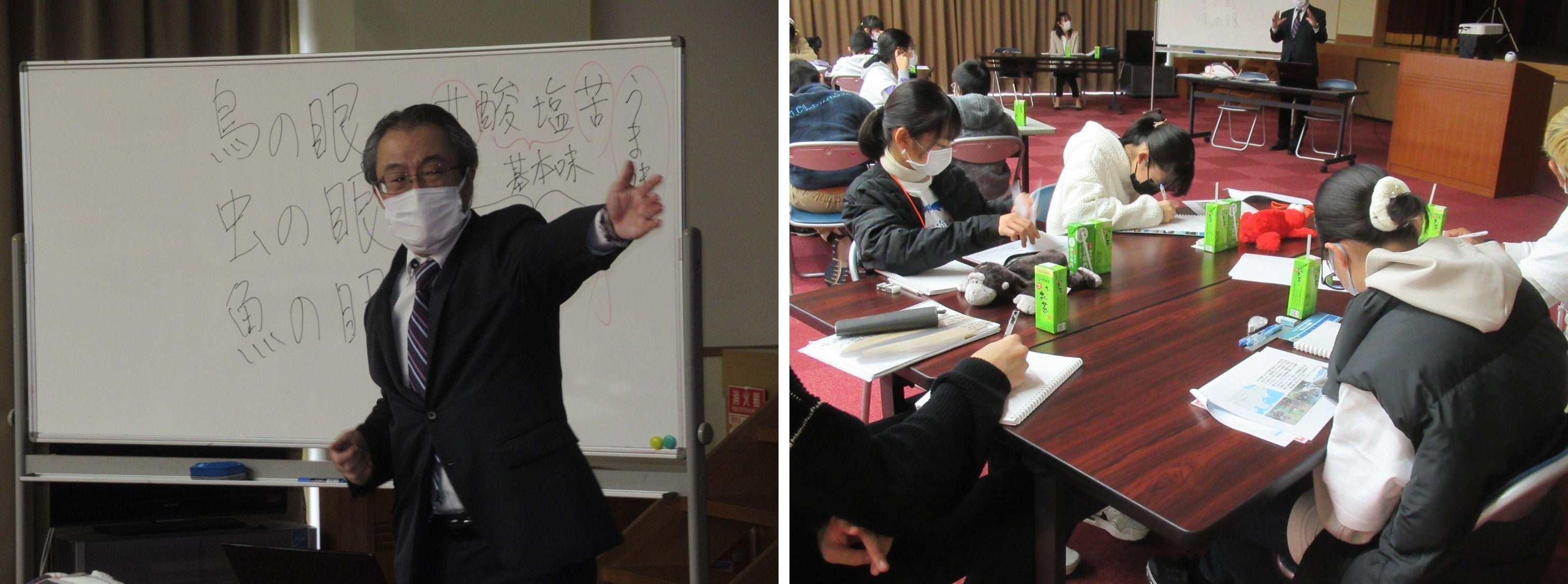 「土佐節」の原料であるカツオ。高知県民はカツオのたたきを始め、カツオに関わる食文化が多く受け継がれていて、消費量も断トツの日本一であることは児童たちもイベント前から知っていました。しかし、そのカツオの漁獲量は年々減少していて、講師を務めていただいたカツオの専門家・受田浩之さん(高知大学副学長)によると、信号で言えば黄色から赤色といった段階のようです。 その主な要因は、世界的な和食ブームなどによりカツオの需要が増えたことから、カツオの主な生息地・南太平洋で小さい魚も一気に取ってしまうまき網による乱獲が増え、日本の沿岸までやってくるカツオが減っていると言われています。一方で南太平洋の国々にとってカツオ漁は生命線のため、簡単に獲るなとも言えない、非常に難しい国際的な問題ということがわかりました。