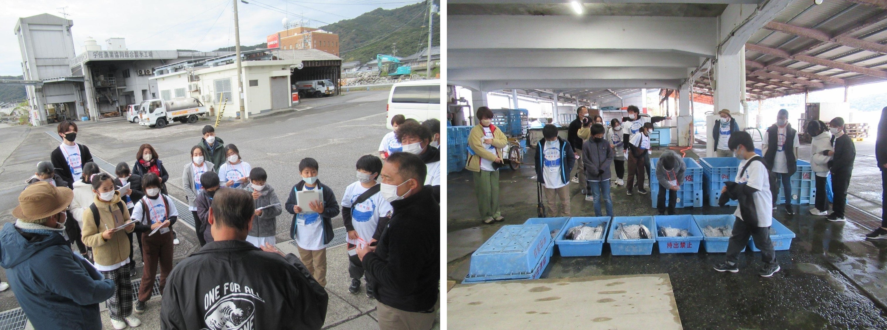 最後に訪れたのは宇佐漁港です。こちらではかつて30隻以上のカツオ漁船が稼働していましたが、現在は3隻のみ。要因は午前中の授業で学んだ、乱獲や海水温・海流の変化による漁獲量の減少だけでなく、人口減少などによる後継者不足の影響も大きいと、漁協の方が児童たちに教えてくれました。それでも高知の漁師さんたちは、1本釣りや引き縄という環境にやさしい、稚魚などを根こそぎ獲ることのない漁法を使って、高知の魚を大切に守り続けています。実際に水揚げされる現場に立ち会った児童たちは、その様子を見ながら、あらためてカツオを普通に食べられていることが決して当たり前ではないこと、これまで以上に大切に食べなくてはならないことを実感していました。