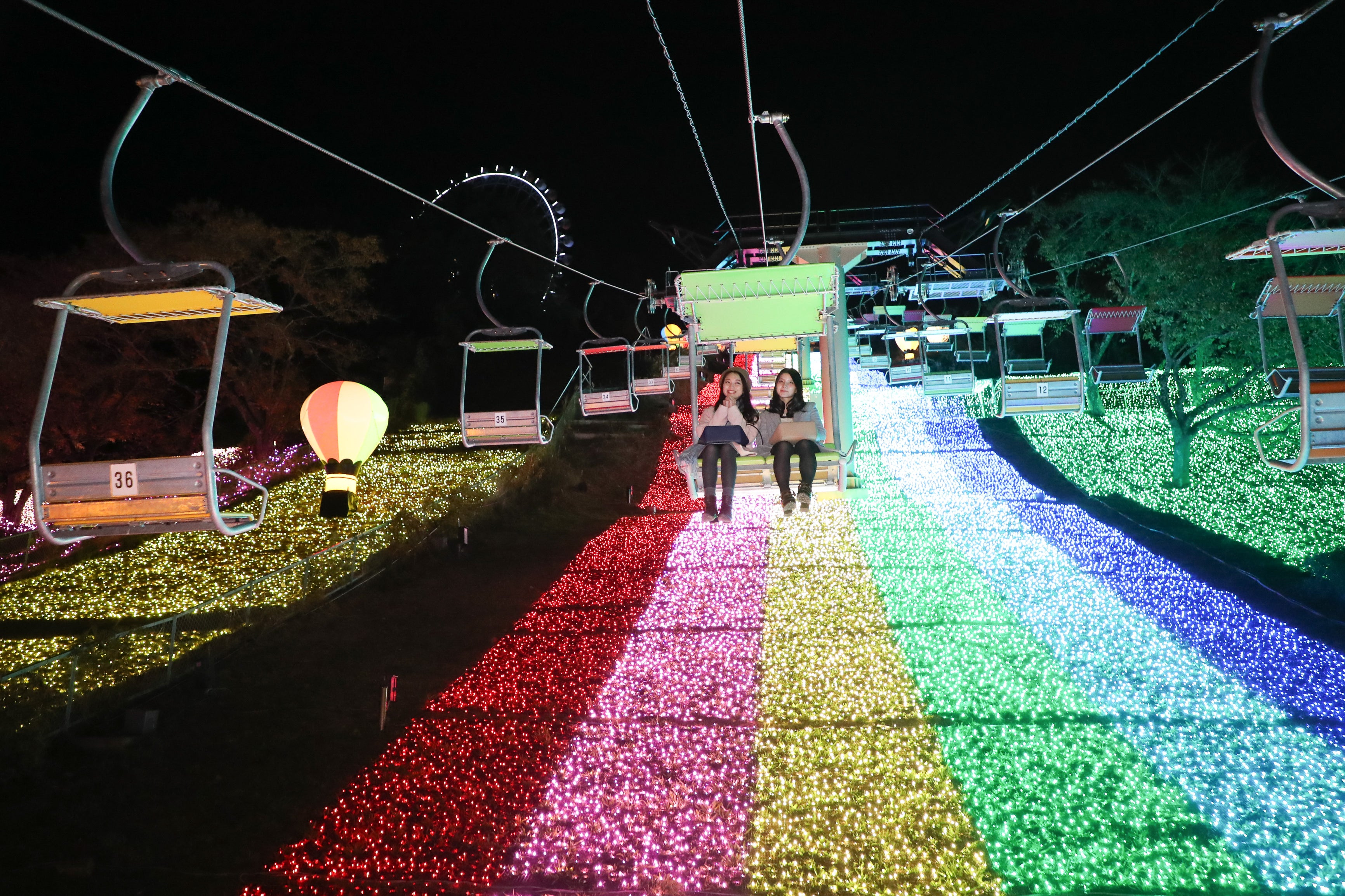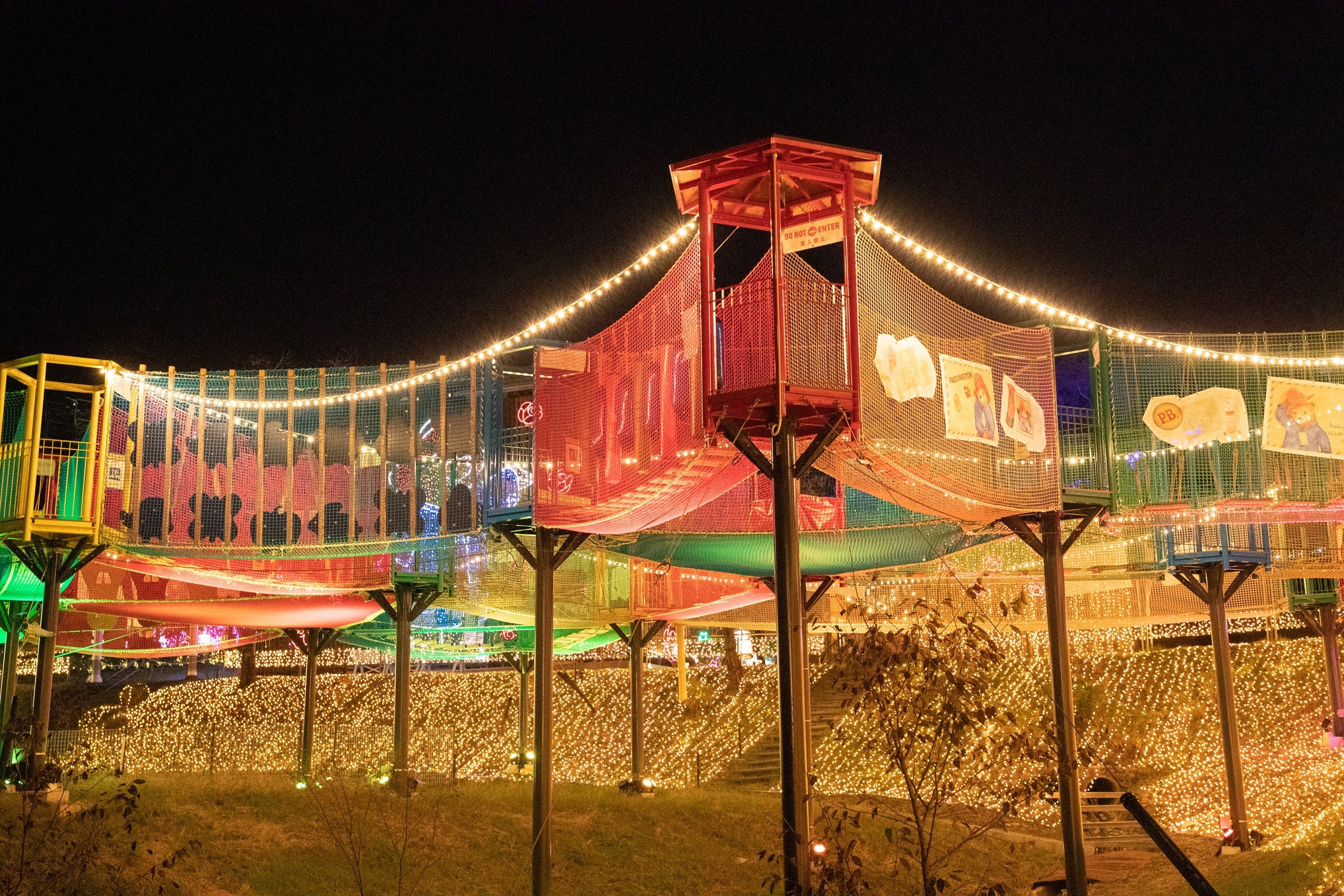 20種類のアクティビティを楽しめる空中ネットアスレチック「ハッスルスパイダー」がカラフルにライトアップし、光に照らされた中で思いっきり身体を動かして遊べる「光の空中アスレチック」として楽しめるほか、小さなお子様も楽しめるアトラクションがあるパディントンタウンでは、光の中をトロッコ型のミニコースターで駆け抜ける「とつげき!パディントン探検隊」や、のんびり楽しく光の汽車の旅を楽しめる「しゅぱつ!パディントン号」などが揃うなど、園内には、イルミネーションに囲まれながら、10種類のナイトアトラクションが楽しめます。そのほか、全長250mのリフトに乗ってイルミネーションの上空を空中散歩する「虹のリフト」や標高370mにそびえる「光のかんらんしゃ」など、起伏に富んだアウトドアリゾートならではの「空から眺めるイルミネーション」が充実しています。