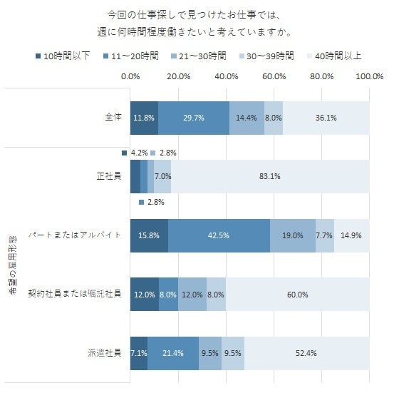 「契約社員または嘱託社員」や「派遣社員」を希望する人では、「40時間以上」を希望する割合が高く、それぞれ半数を超えていた。正社員を希望する人以外でも、より多くの時間働きたいという声は少なくないようだ。