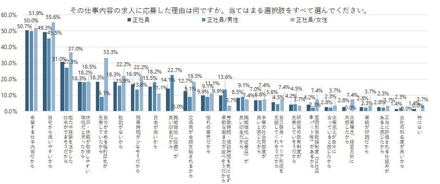 一方、「女性」のほうが「男性」よりも「自分が求める福利厚生が充実していたから」が24.2pt、「自宅から通いやすいから」が10.1pt、「能力や経験を活かした仕事ができそうだから」が9.7pt高くなった。特に福利厚生に関して大きく差が出ており、自分に合った福利厚生がある企業を探している人が多いことがわかる。