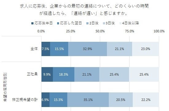 全体では「2日後」が最も多く32.9%、次いで「4日後以降」が23.0%、「3日後」が21.1%、「応募した翌日」が15.5%、「応募後半日」が7.5%となった。2日後になった時点で「遅い」と感じる人が急激に増えるため、可能ならば応募があった翌日までに、面接の日程調整等の連絡をしたいところだ。
