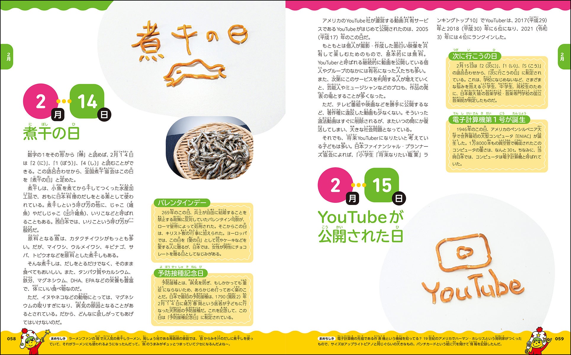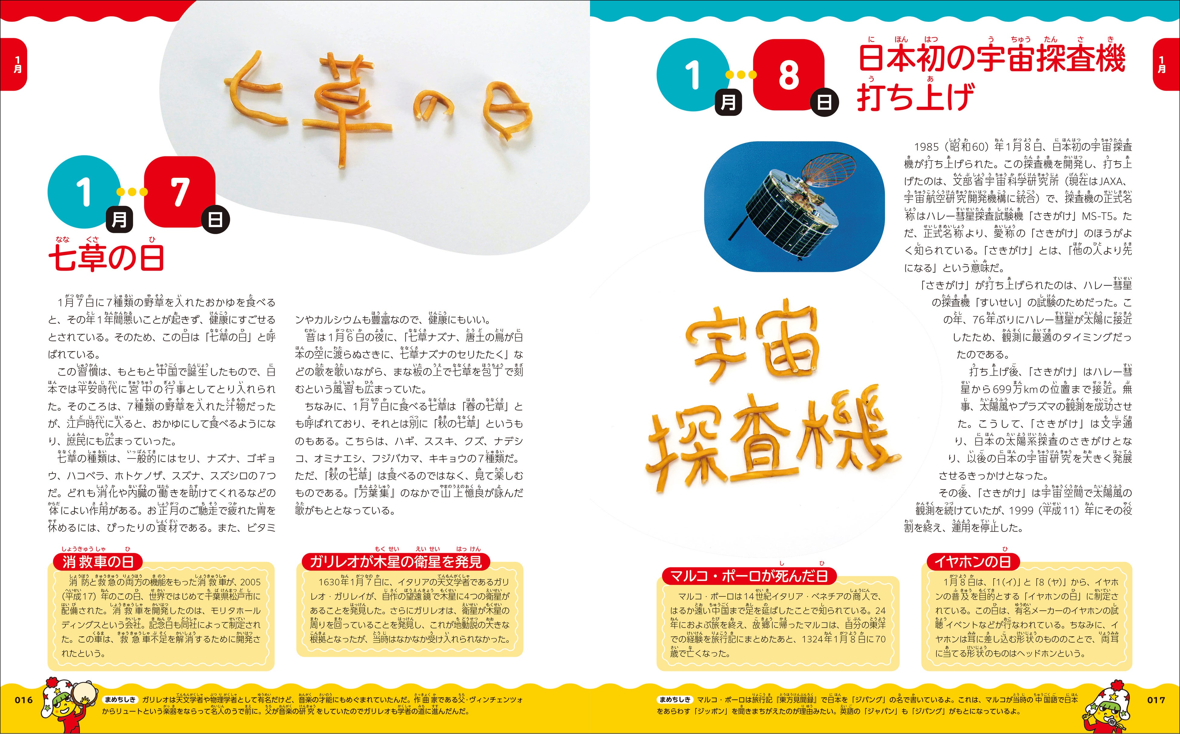 ツイッターでは、ベビースターラーメンを使って文字をつくる「めん文字」で人気を博しているのを知っていますか?本書は、そんな「めん文字」を使って1年366日の記念日、行事、歴史的事件、出来事などを紹介する子ども向け教養事典です。