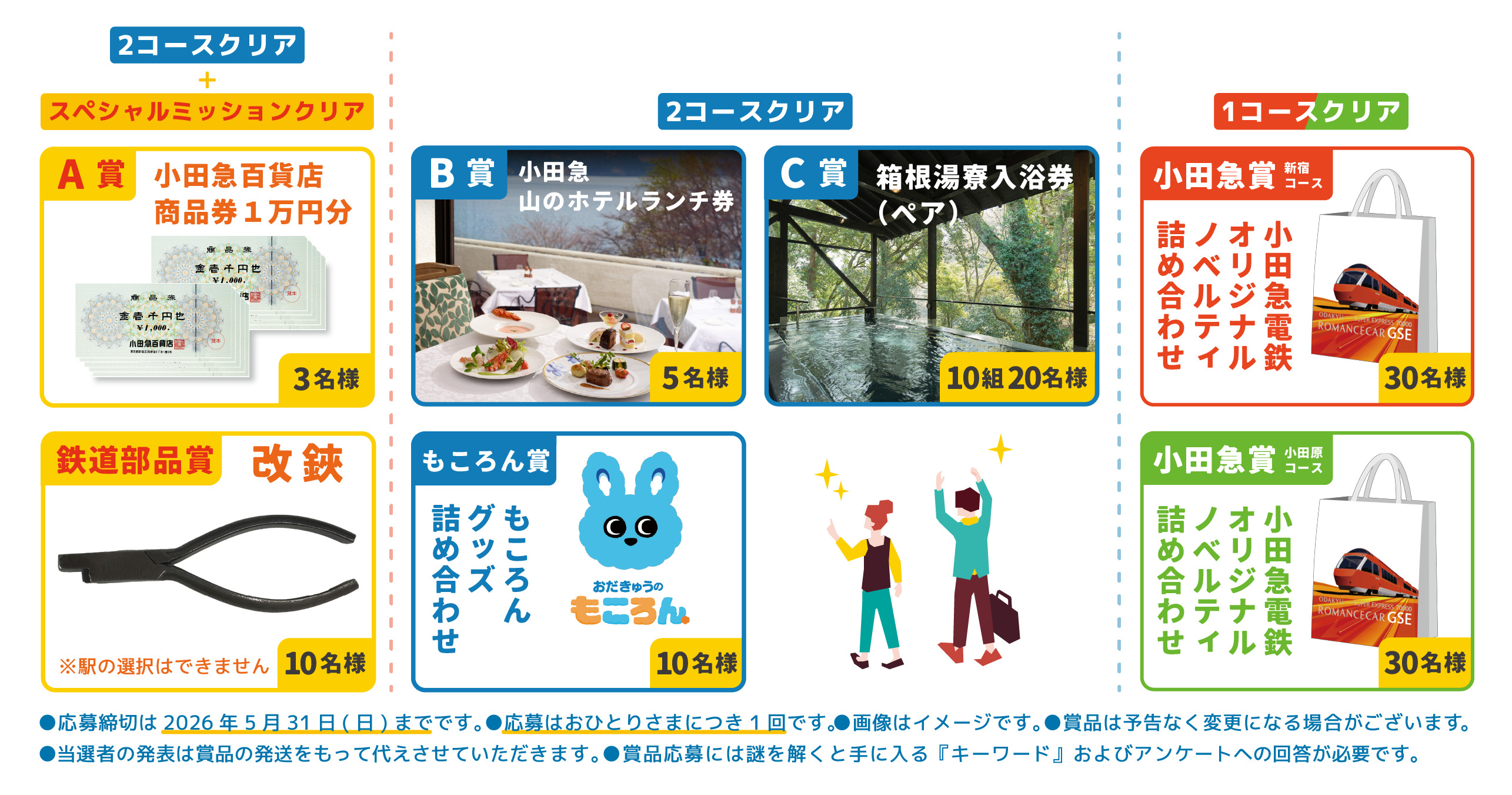 クリアしたコース数に応じて、駅で使用していた「改(かい)鋏(きょう)」や「小田急百貨店商品券(1万円分)」、「山のホテルランチ券」「もころんグッズ詰め合わせ」などの賞品が当たる抽選にもご参加いただけます。
