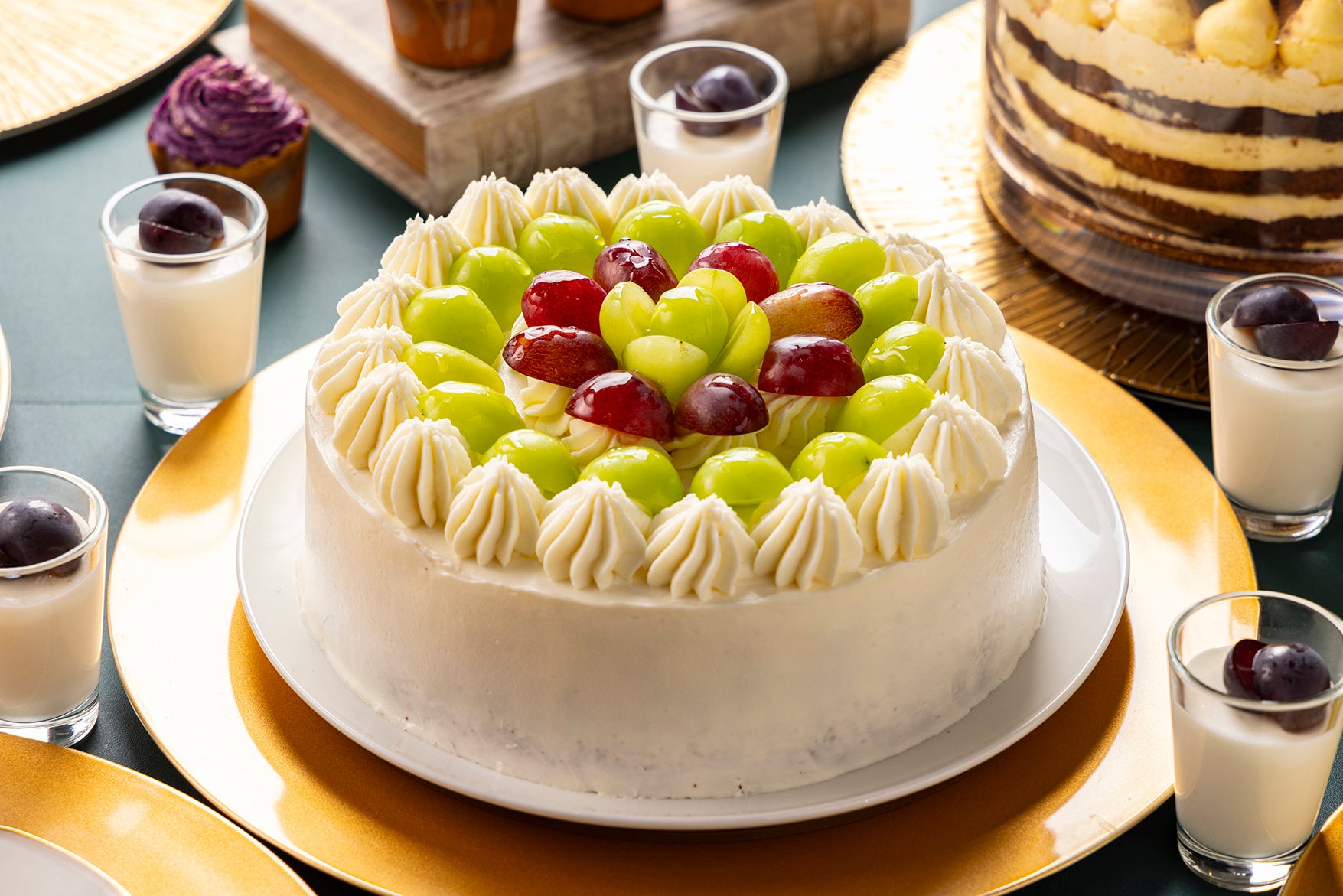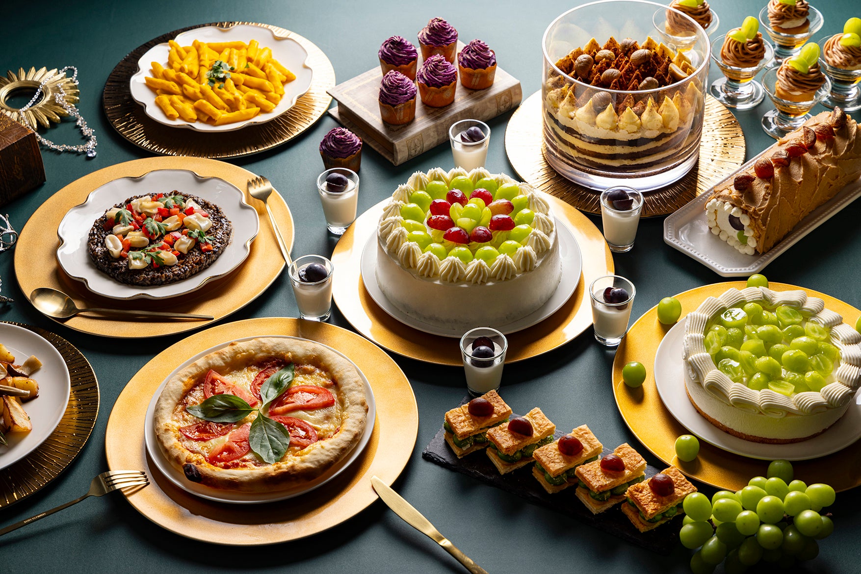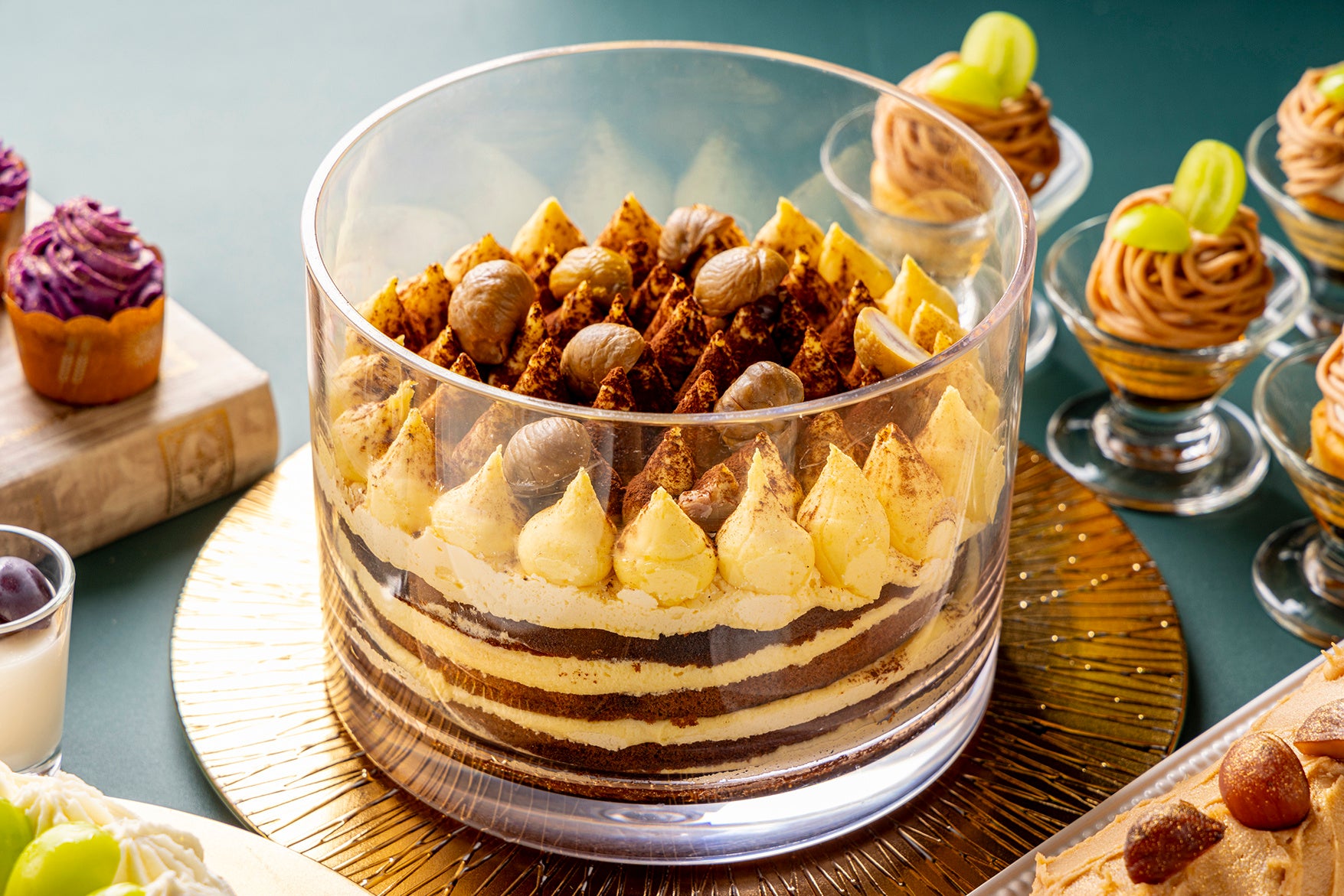 シャインマスカットとクイーンニーナのショートケーキ、シャインマスカットとマイハートのタルト、シャインマスカットのフロマージュケーキ、フランス産栗とぶどうのロールケーキ、和栗と抹茶のミルフィーユ、巨峰のムースケーキ、栗とほうじ茶のカップケーキ 紫芋のホイップ、巨峰のヴェリーヌ、パンケーキ、マロングラッセのティラミス、イタリア産栗とオレンジ香るババのモンブラン、巨峰のシャーベットほか