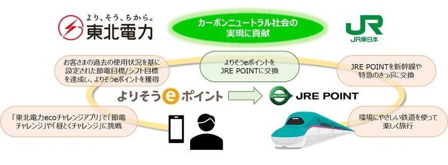 今回のサービス開始により、東北電力が実施する「東北電力ecoチャレンジ」の節電目標・使用時間帯のシフト目標の達成などによって貯まった「よりそうeポイント」を「JRE POINT」に交換し、環境負荷の少ない交通手段である鉄道をご利用いただくことができるようになります。東北電力とJR東日本は本サービスを通じてお客さまの省エネを促進し、カーボンニュートラル社会の実現に貢献してまいります。