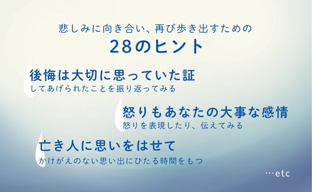 深く落ち込む人、まわりの声に違和感を覚える人、怒りを覚える人、後悔にさいなまれる人、それぞれの悲しみの形があります。