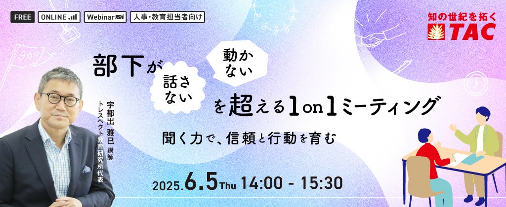 公認会計士や税理士など、多くの国家資格や検定試験の受験指導などの教育事業を展開しているTAC株式会社(東京都千代田区、代表取締役:多田敏男)は、法人向け人材教育部門から、人事・教育担当者に向けに「信頼と行動を育む部下が「話さない」「動かない」を超える1on1ミーティング」を2025年6月5日(木)に実施します。